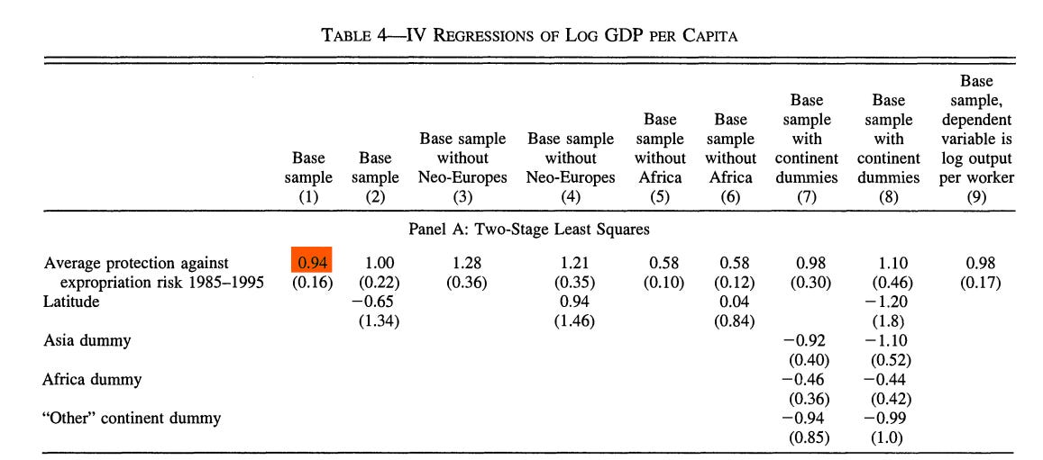 They find that the countries who are predicted to have a low institutional quality score based only on their historical settler mortality also end up having much lower per capita incomes today. A one point increase in predicted institutional quality (on a ten point scale where Nigeria is 5.6 and Chile is 7.8) is associated with a bit more than a doubling of per capita GDP today.