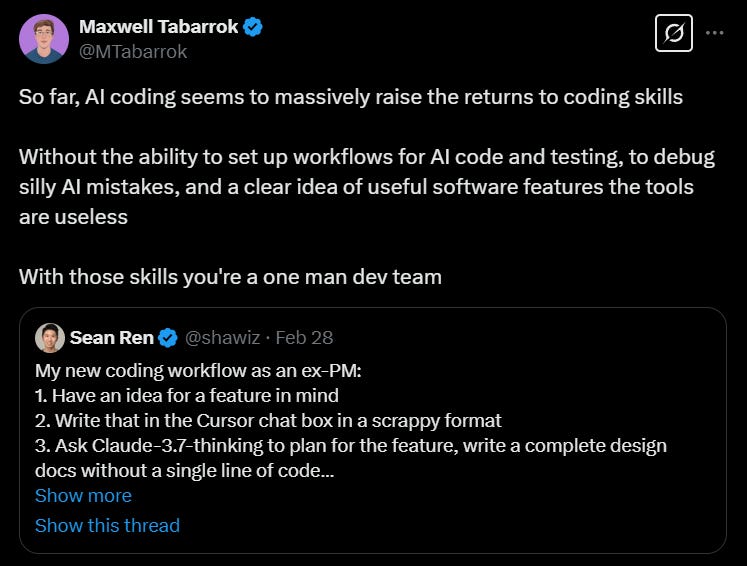 Deep Research doesn't close the gap between the productivity of the most skilled academics and the least skilled ones, it widens it. If you have taste, determination, and enough knowledge to evaluate AI outputs, then you can run a one-man research lab. Most people lack these skills. I have a chance to be at the frontier of using AI for economics research.