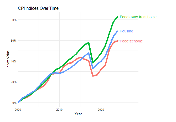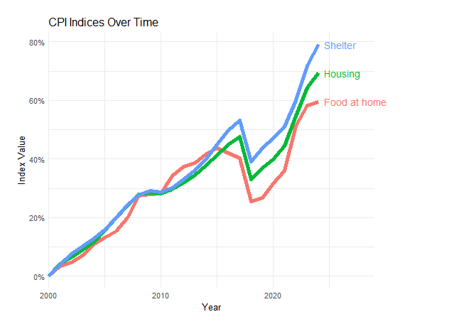 The BLS series for “Housing” is also an aggregate index of “Shelter” prices, which is the actual rent (or Owner Rent Equivalent), and other expenses like utilities, moving, and repairs. Stagnant construction productivity and land use regulation will show up mostly in rents so these other pieces of the series are masking a bit of the inflation.