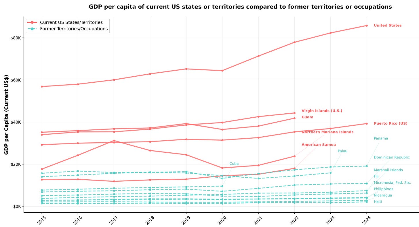 Reluctance to give up what we kept isn’t just status quo bias. The economic performance of the states and territories still within the US compared to the nations we once controlled but are independent today is evidence that American annexation has large positive effects. The causal inference in the opposite direction is even more intuitive: how much poorer would Hawaii become if it were cut off from the American economy, immigration, and institutions? More precise causal inference on the positive economic effects of American annexation is available here.